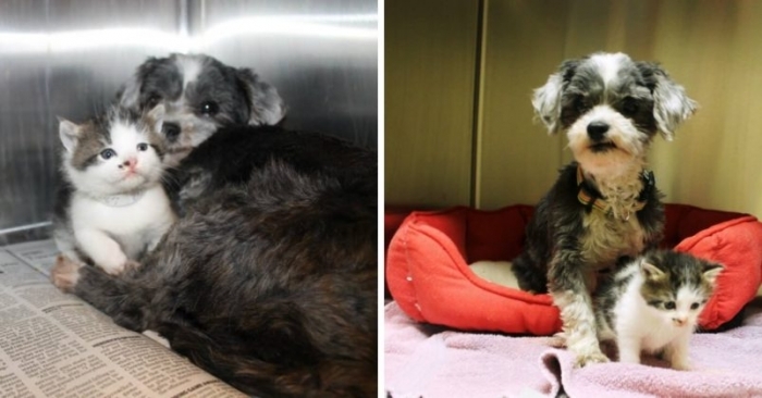 Az aranyszívű kutyus sajátjaként nevelte az árva kiscicát