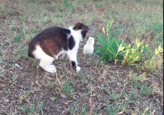 Igen alaposan szemügyre vette a cicát, aminek az lett a következménye, hogy a cica meghátrált, pár méterrel táv ...