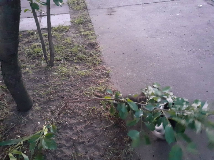 Az udvarban ami mozgatható, mind letörve, lehajlítva! Ez a kis meggyfa susnyó a jelenlegi áldozat!